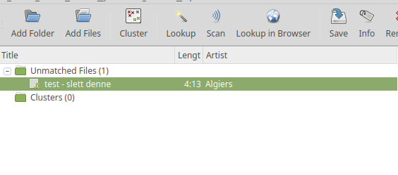 Når Picard er riktig innstilt er det på tide å merke noen filer! Trykk 'Add Files' eller 'Add Folder' og velg filen(e) som skal merkes. Filen(e) legger seg under 'Unmatched Files'