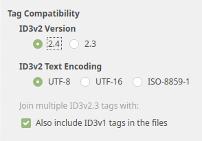 Picard er installert på radioens maskiner og stilt inn så standarden id3v2.4 brukes automatisk. Hvis du jobber på andre maskiner / med andre programmer, sjekk innstillinger for å se at du bruker riktig format. Picard kan lastes ned her.