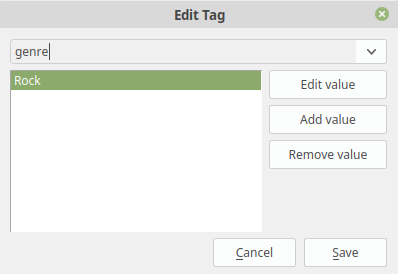 Hvis en tag som feks 'Genre' mangler, høyreklikk i et av feltene under 'Tag' og velg 'Add New Tag...' I dialogen som kommer opp, skriv 'g' og velg genre i det øverste feltet. Trykk 'Edit value' og fyll inn.