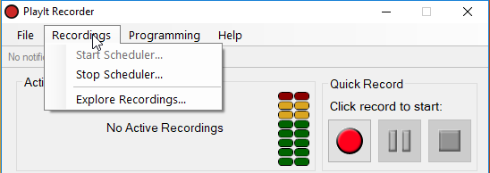 PC på teknikerrommet er satt opp med PlayIt Recorder som kan ta opp sendinger manuelt og lagre dem som wave-filer. Dette formatet er valgt for at det skal være mulig å redigere opptakene etter sending uten tap av lydkvalitet.