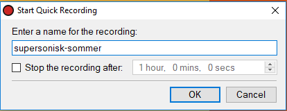 For å starte ett opptak må du gi den et navn. Hvis opptaket er et program som skal legges inn i airtime skriv programnavnet, uten mellomrom, bruk eventuelt bindestrek. Ikke legg til dato, det legges automatisk til.