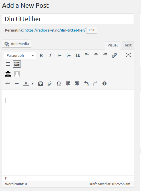 Publiseringsverktøyet oppfører seg ganske likt som word og andre tekstredigeringsprogrammer. Trykk Add Media for å legge inn bilde eller lyd.
